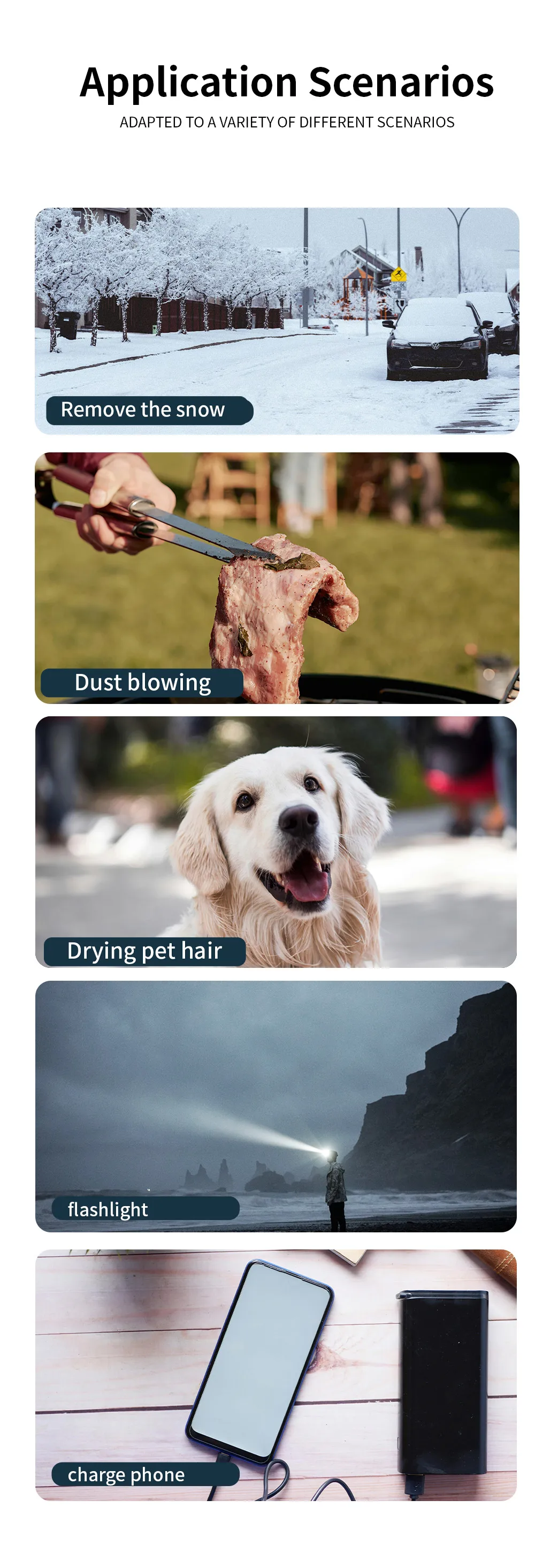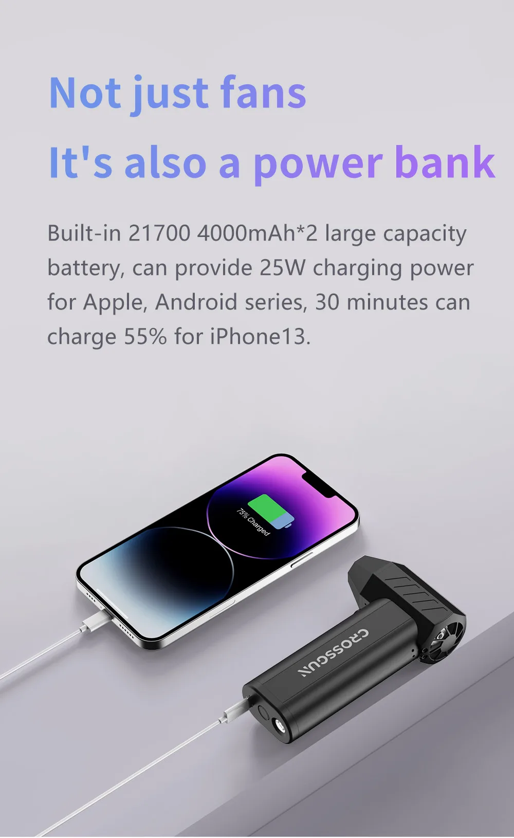 The X6 PRO can charge your phone in emergency situations (supporting phones from different brands around the world), with a 25W fast charger to say goodbye to the hassle of slow charging. We recommend using dual Type-C interfaces (we will provide you with a Type-C data cable, but if your phone has other charging interfaces, you can only prepare the data cable yourself). It can easily handle various unexpected situations. It’s not just a jet fan. Therefore, we recommend that you regularly charge it when traveling, as its unique power bank function is very practical.