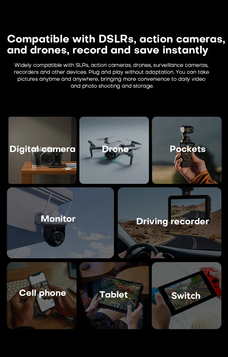 Perfectly optimized for Nintendo Switch, drones, action cameras, Android smartphones, dash cams, and more.